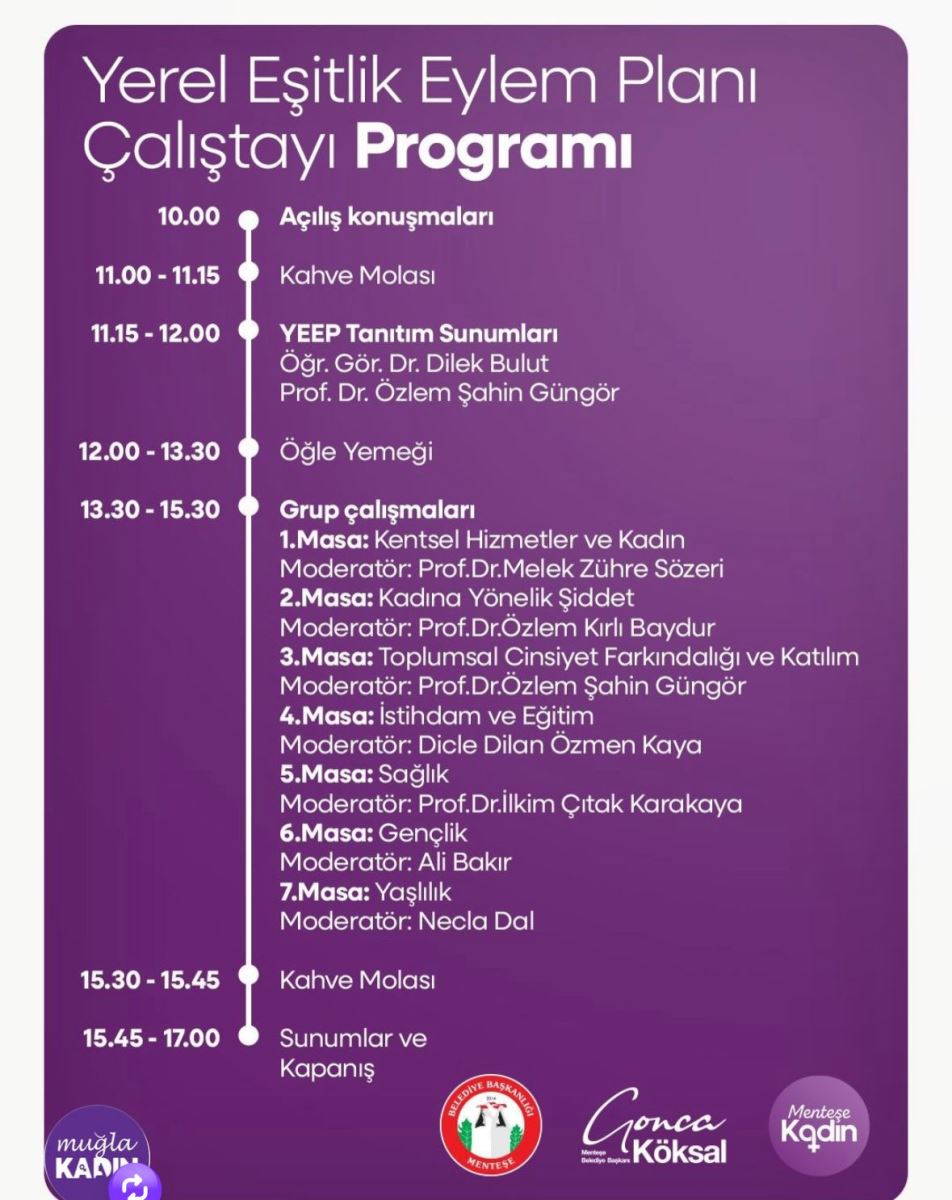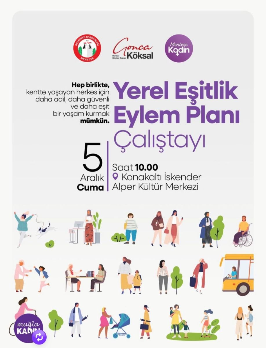 Menteşe Belediyesi'nin 05.12.2025 tarihinde Türkan Saylan Çağdaş Yaşam Merkezi'nde düzenlenen Yerel Eşitlik Eylem Planı Çalıştayı'na bölüm öğretim elemanlarımızdan Öğr.Gör.Dr. Dilek BULUT programın tanıtım sunumunu yaparak, lisans öğrencilerimizden Güler Delal Kımkak eşitlik ve kadın masasında, Seval Korkmaz gençlik masasında ve Azra Muhtar yaşlılık masasında yer alarak çalıştaya katkı vermişlerdir.